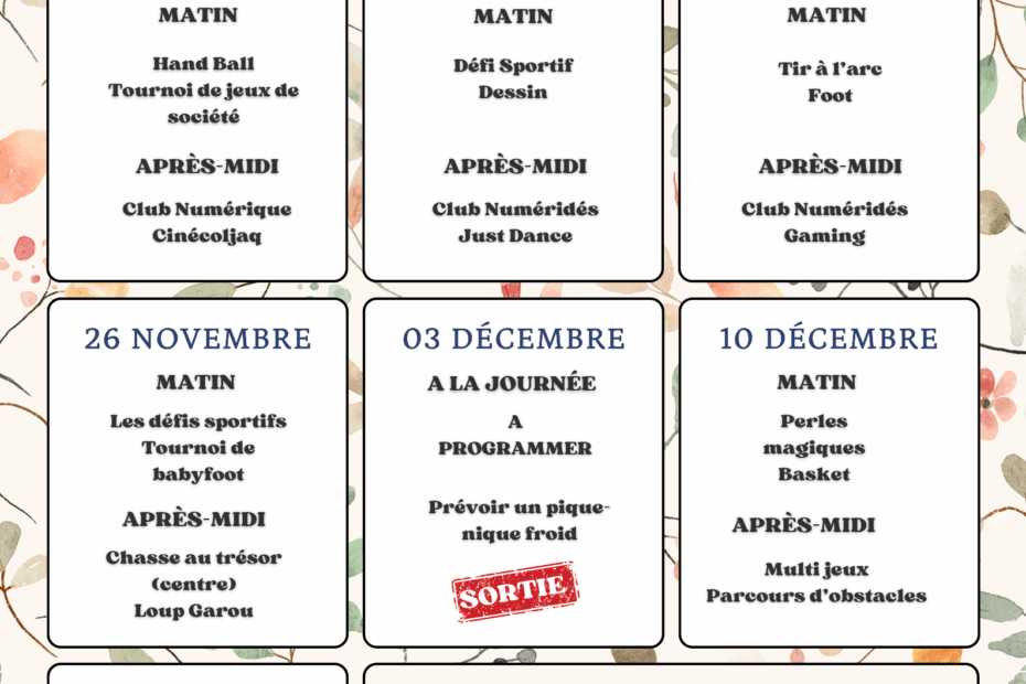 Au programme : des activités variées, ludiques et éducatives, adaptées à chaque tranche d’âge, dans un cadre bienveillant et dynamique. L’équipe d’animation prépare déjà des mercredis riches en découvertes, en jeux et en bonne humeur pour accompagner les enfants jusqu’aux vacances de fin d’année.