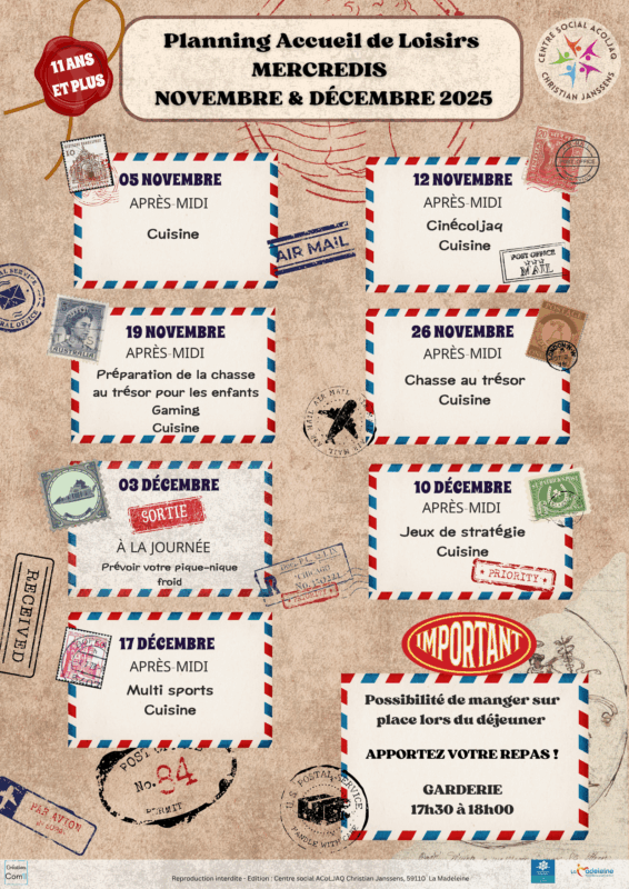 Le Centre Social ACOLJAQ est heureux d’annoncer le lancement des inscriptions pour les accueils de loisirs des mercredis de novembre et décembre 2025 !